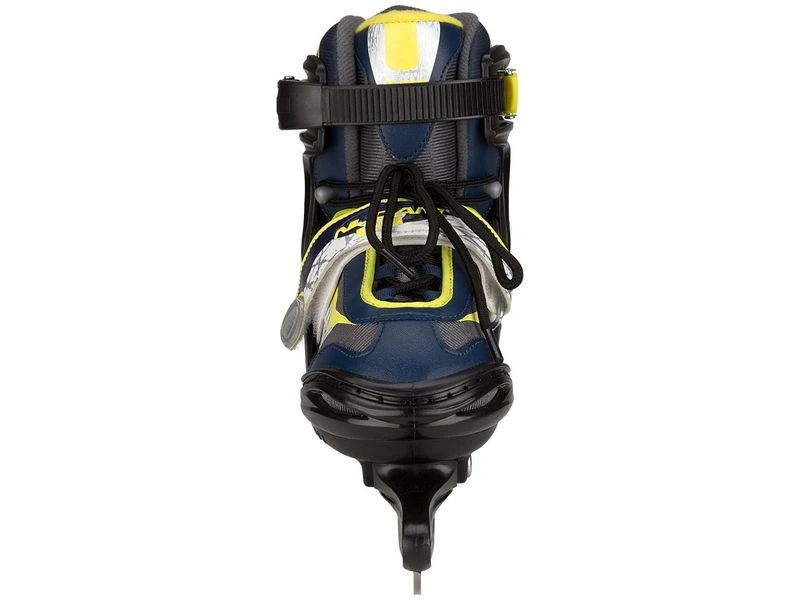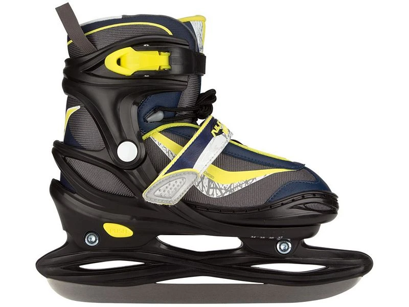 De antraciet/marine/fluorgele Nijdam Junior Semi-Softboot ijshockeyschaats maakt je superwendbaar en ook flitsend snel zoals iedere ijshockeyspeler wil zijn. De harde TPE delen bij de enkel, de hiel en de tenen vangen de vele klappen van het ijshockeyen op terwijl de zachte binnenschoen de schaats erg comfortabel maakt om te dragen. Met de knop aan de onderzijde is de maat van de schaats eenvoudig aanpassen zodat ze jarenlang meegaan. Een degelijke sluiting en maakt de schaats af.